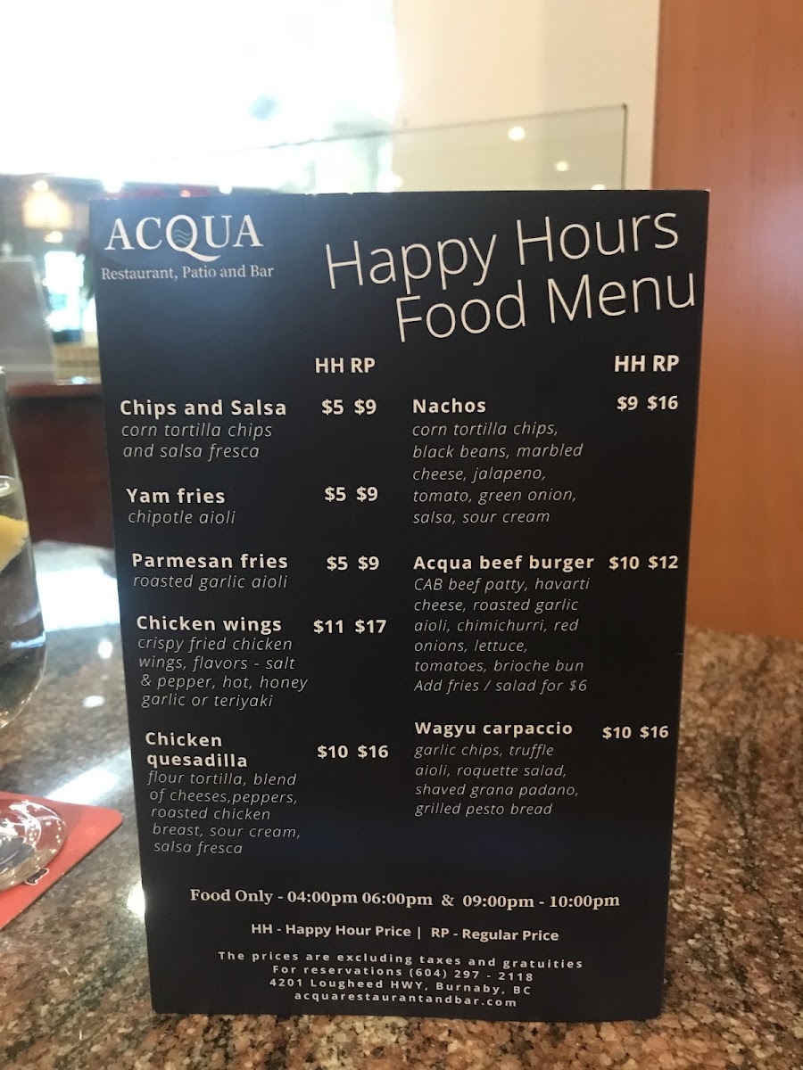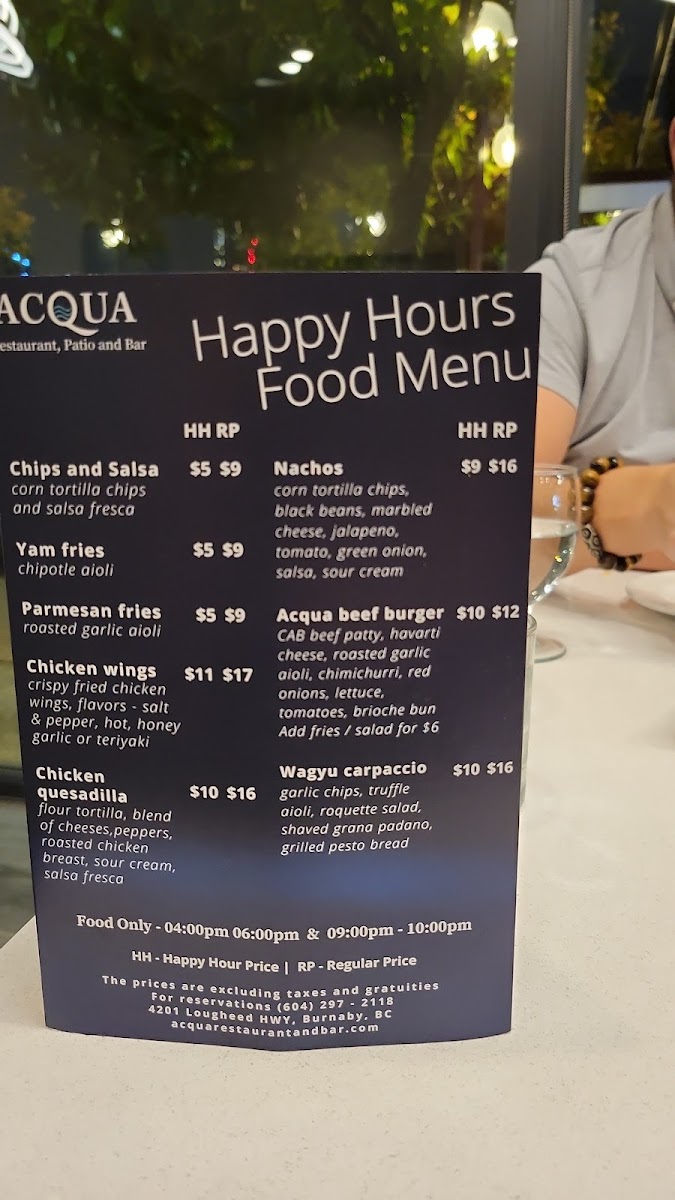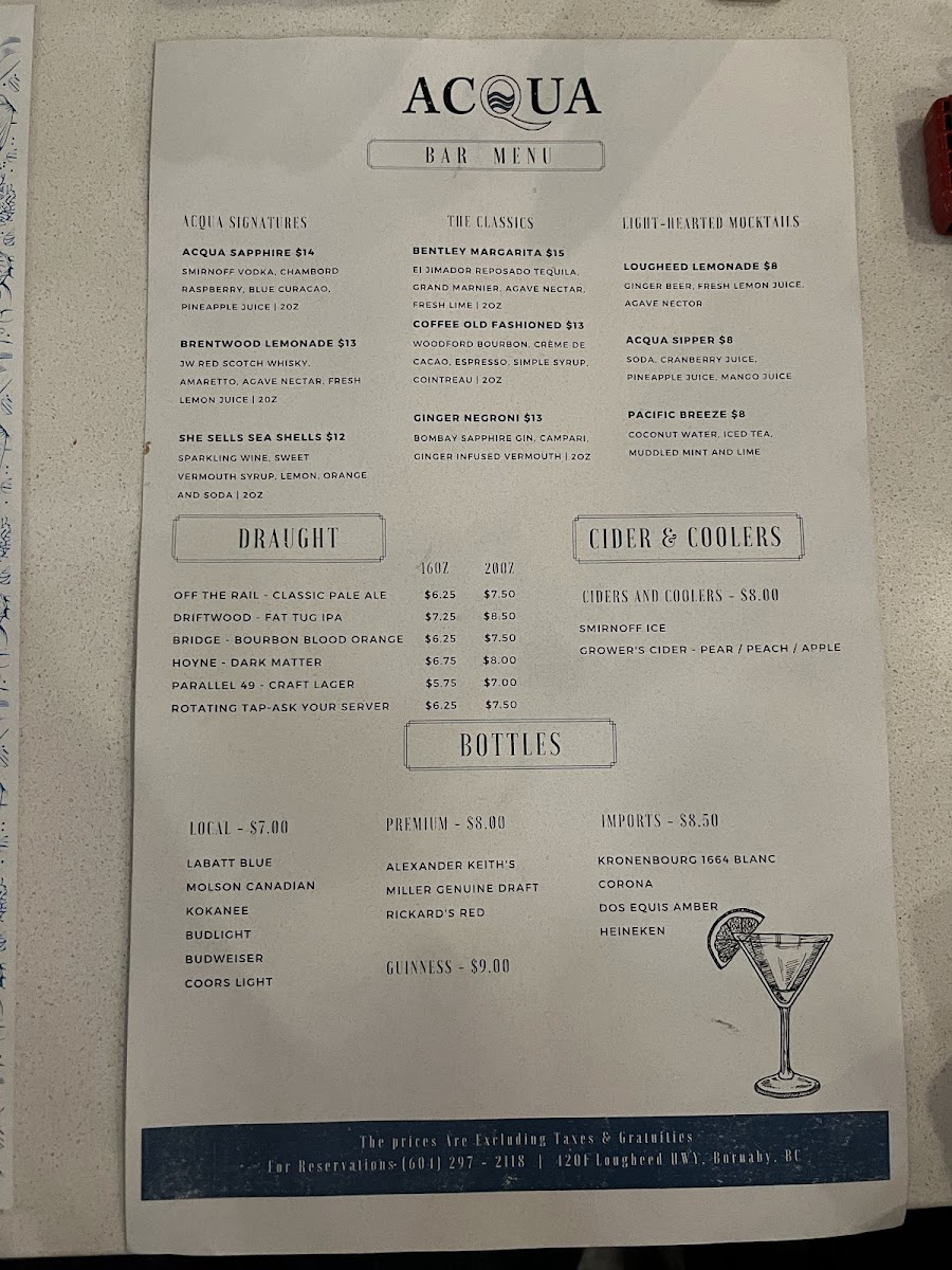 Welcome to Acqua Restaurant, Patio and Bar, a culinary oasis nestled in Burnaby, BC. With a diverse dinner menu that boasts handcrafted dishes, Acqua stands out for its commitment to exceptional flavors and quality ingredients.